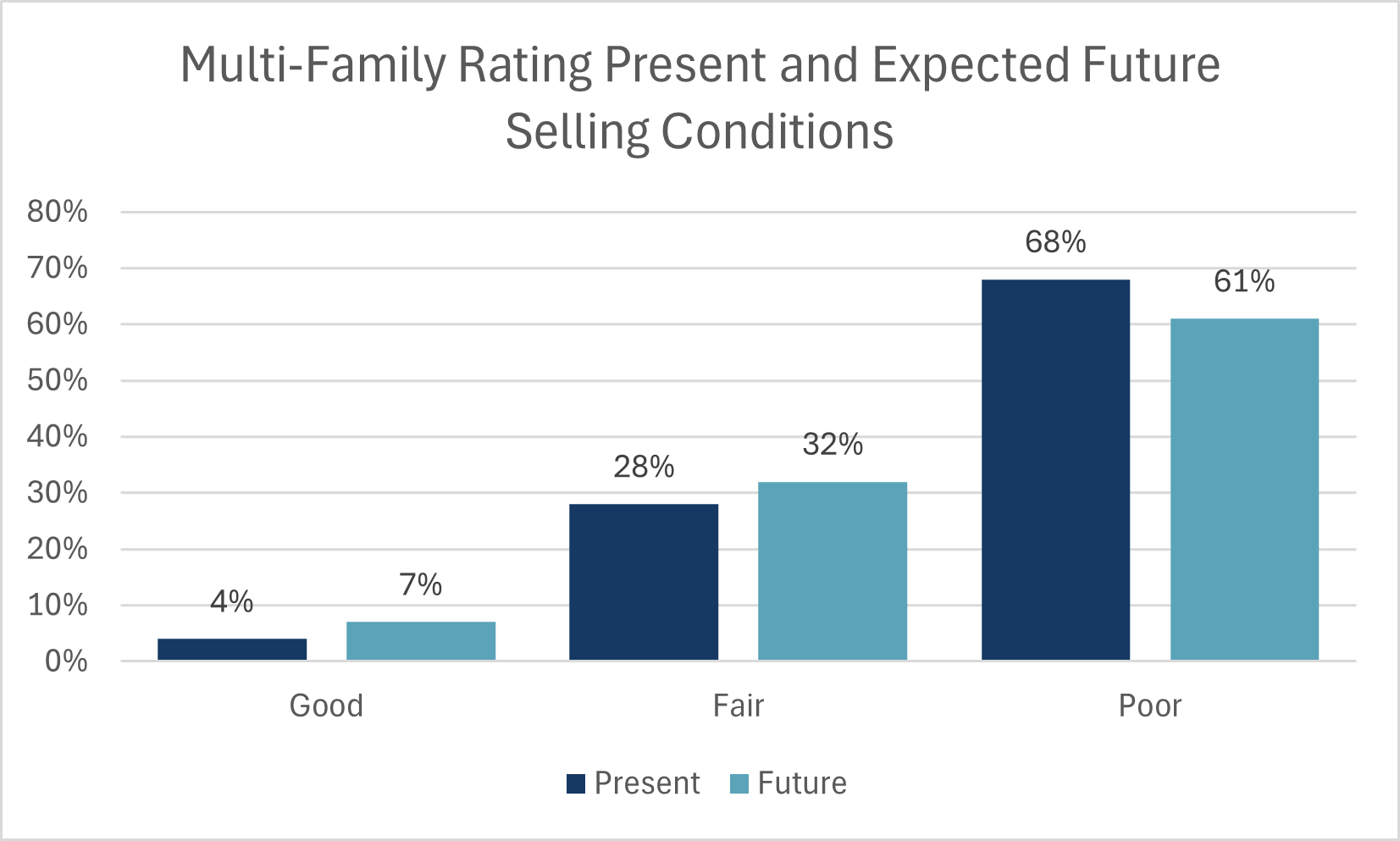 - The majority of multi-family builders rated both current and future conditions as Good (78% and 73%, respectively).