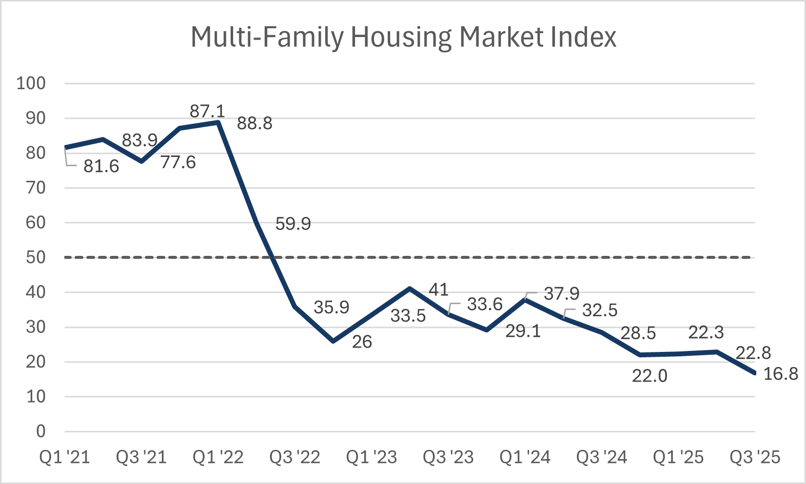 - The multi-family Housing Market Index in the third quarter was 16.8, which is an unfortunate but not unsurprising new record low. This comes after the multi-family HMI held around a score of 22 since the last quarter of 2024.