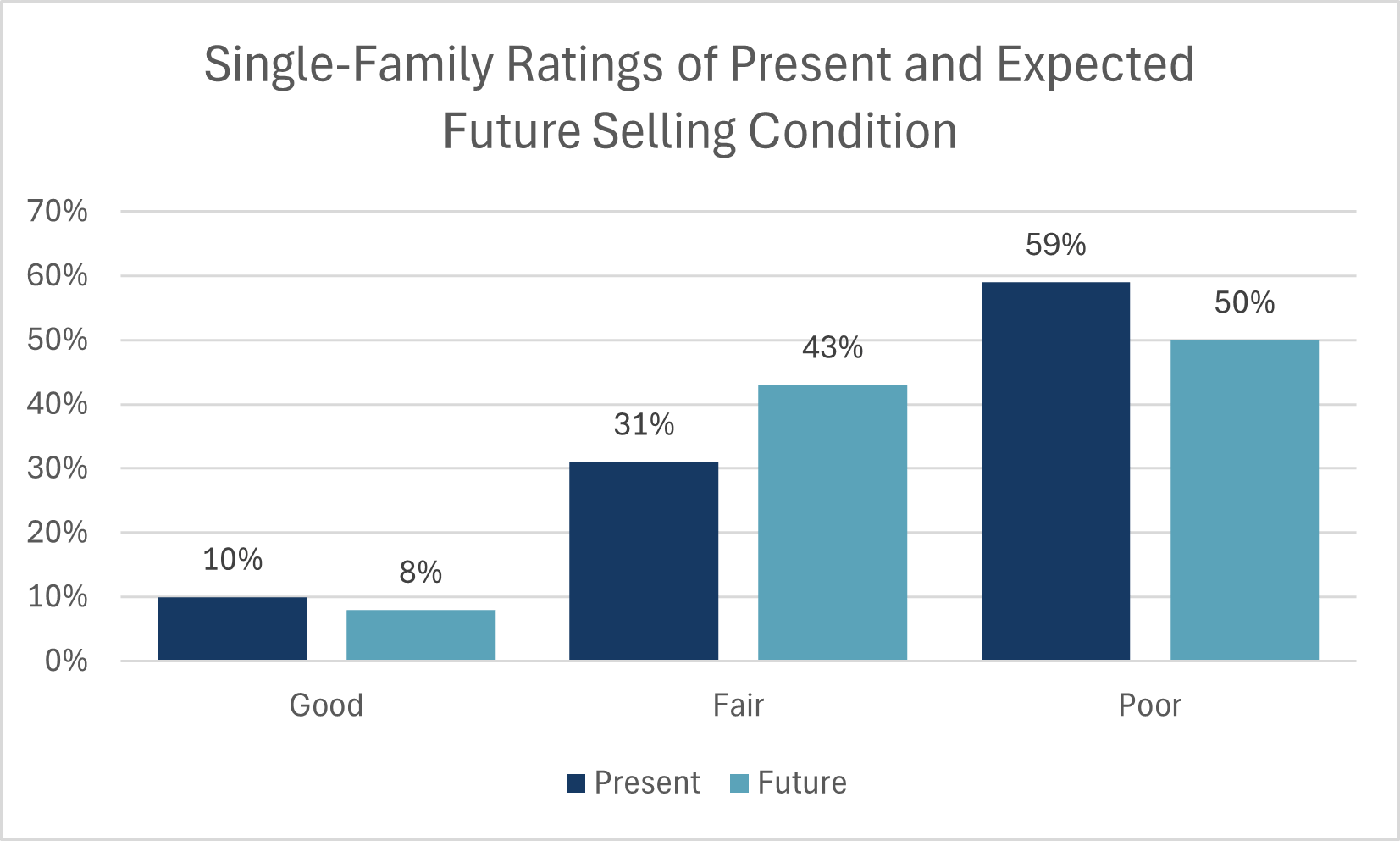 - 59% of single-family builders rated current selling conditions as Poor, equal to the proportion reported in the previous quarter.