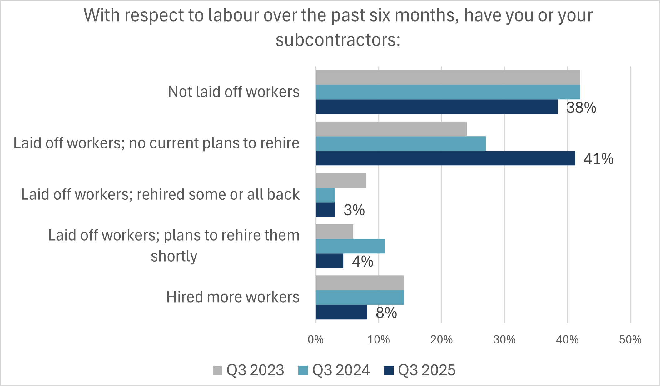 - There was a stark increase in the proportion of builders reporting permanent layoffs this quarter relative to years past. 41% of builders reported recent layoffs with no plans to rehire. This up substantially from the 27% reported in Q3 last year and even well above the 35% reported in the previous quarter.