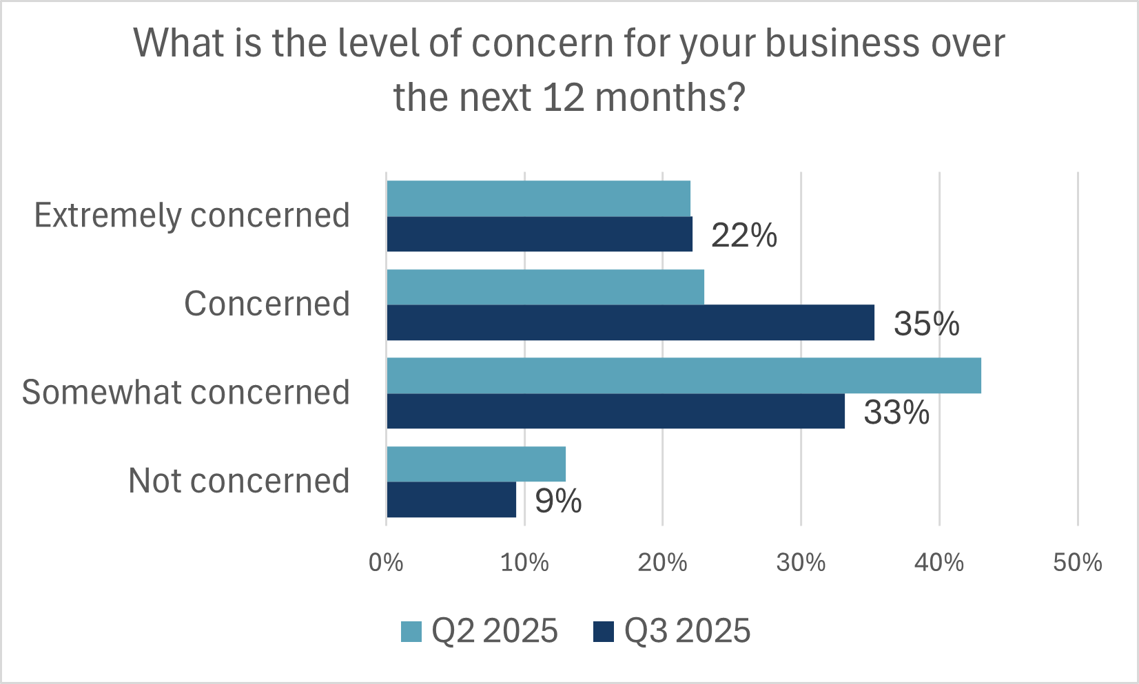 - Difficult sales conditions and the increase in permanent layoffs have also raised the overall level of concern builders have on the outlook of their business. 57% of builders are concerned or very concerned about their business over the next 12 months. This stemmed from a shrinking proportion that were just somewhat concerned.