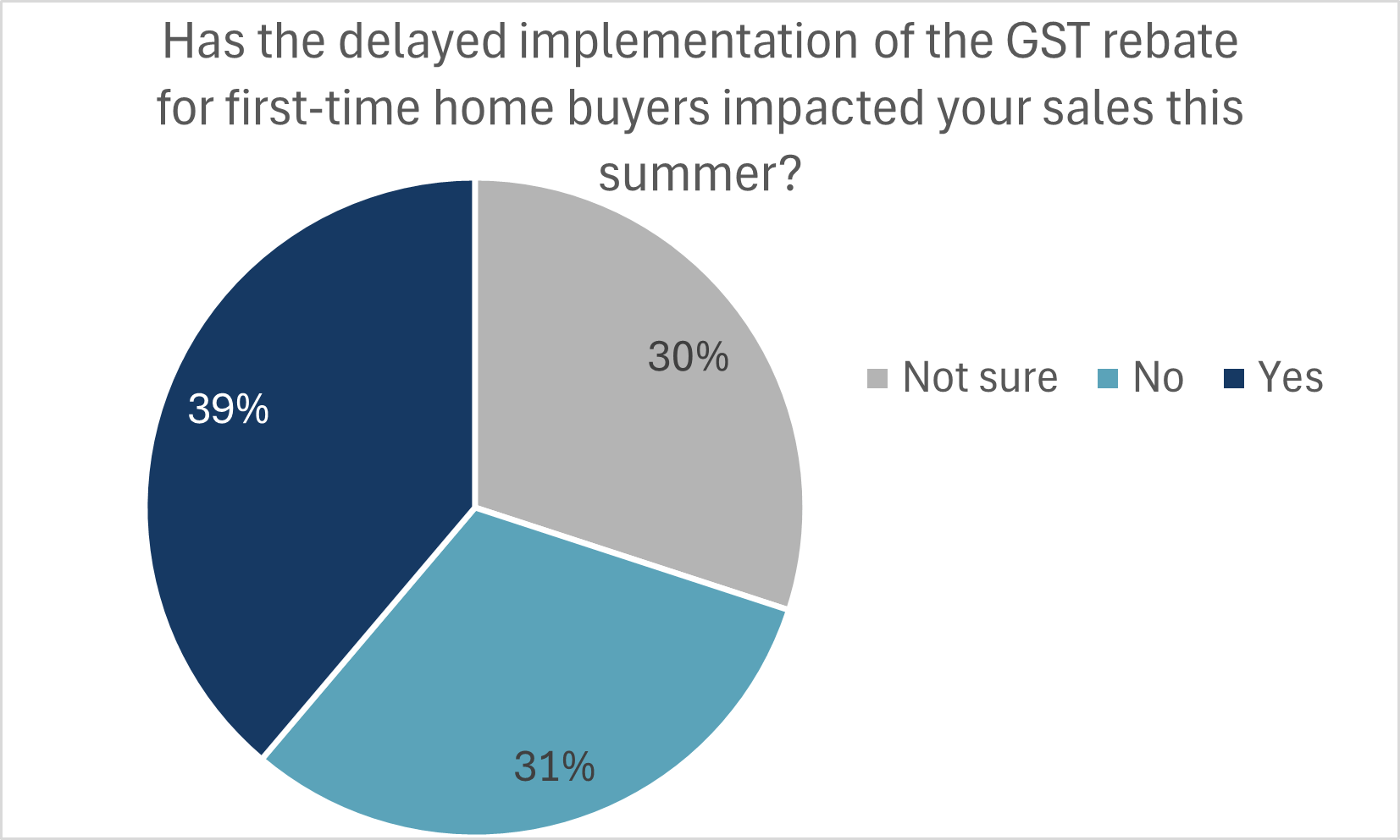- The first-time buyer GST rebate remains a drag on sales due to its lack of implementation—it has yet to be given royal asset. 39% of builders stated that they their lack of a guarantee for FTHBs that they would be eligible for this rebate hurt summertime sales. This is roughly the proportion of builders that offer entry level units or units that would be within the budgets of FTHBs.