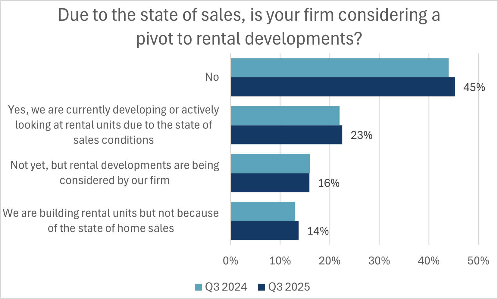 - Following up from a question posed last year, builders were asked if they are or are considering construction of rental units. The distribution across answers remains consistent with last year’s results, as 23% of respondents saying that their firm is developing or actively considering rental units. A further 16% stated that this is informally under consideration.